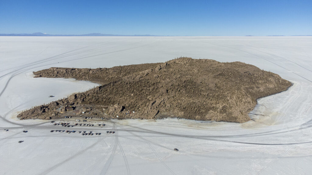 Náš deň však zďaleka nekončí. Naše kolesá — a najmä náš sprievodca — nás priviedli na Isla Incahuasi, koralový ostrov uprostred soľného mora, posiaty tisícročnými kaktusmi. Toto miesto je úplným kontrastom toho, odkiaľ sme prišli. Kým severné pobrežie je tiché a ešte takmer neobjavené, Isla Incahuasi je pravdepodobne najnavštevovanejším miestom celej pláne (ak nerátame mesto Uyuni).