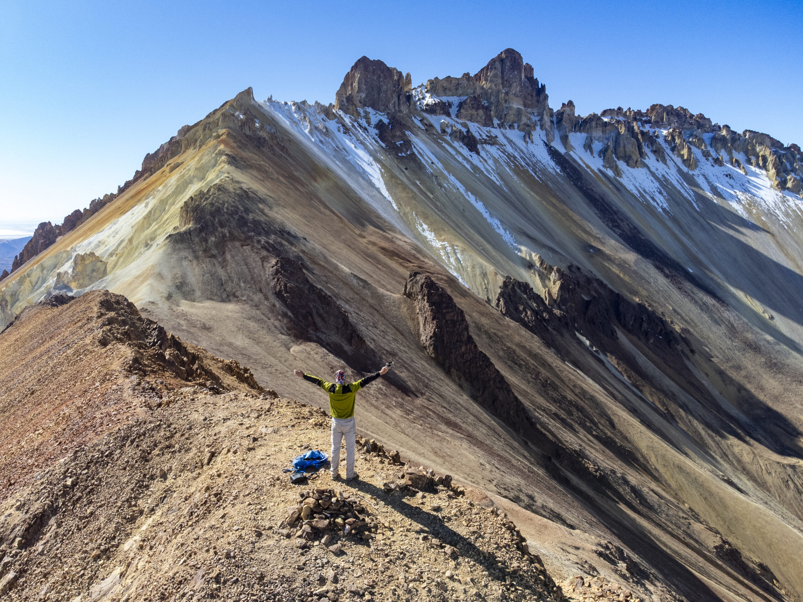 Napriek tomu vyťahujem dron a užívam si a natáčam veľkolepé výhľady. Za chrbtom nekonečná belosť Salaru Uyuni, predo mnou mohutný kráter posvätnej hory Tunupa. Dokonalá odmena.