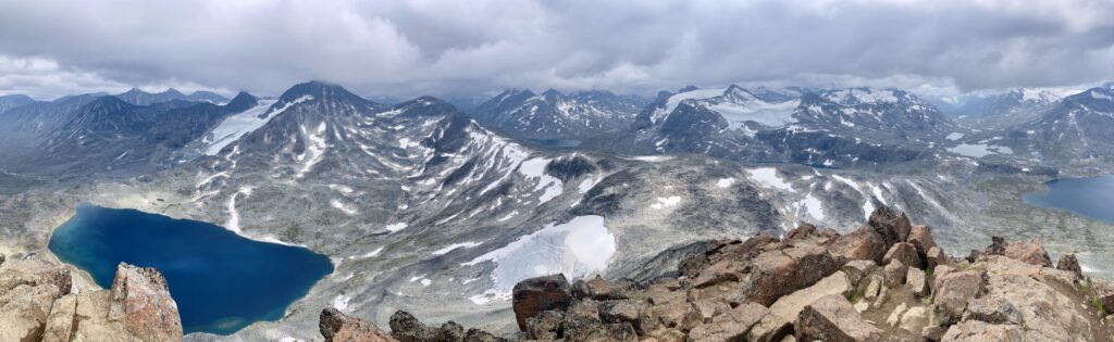 Z vrcholu sa mi otvárajú široké výhľady na Jotunheimen a na jazero Kyrkjetønnet, ktoré leží hlboko v doline, priamo pod vrcholom. V kombinácii so skalnatými hrebeňmi a ľadovcami v diaľke ide o jeden z tých výhľadov, kvôli ktorým sa oplatí štverať sa do výšin.